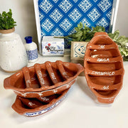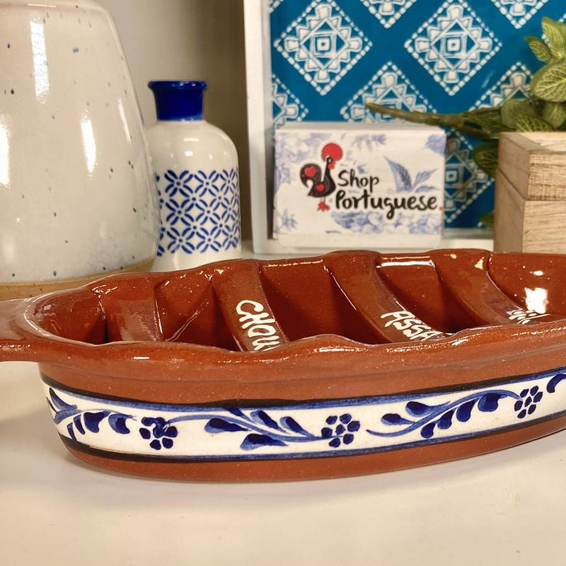 Hand-made in Portugal, this "Boat" shaped Roaster is a unique gift and the perfect addition to any Portuguese kitchen. Convenient handles on each side make it easy to transport and each boat is hand painted Just add any grain alcohol or aguardente into the bottom of the roaster and cook your chouriço, linguiça or any of your favorite sausages!