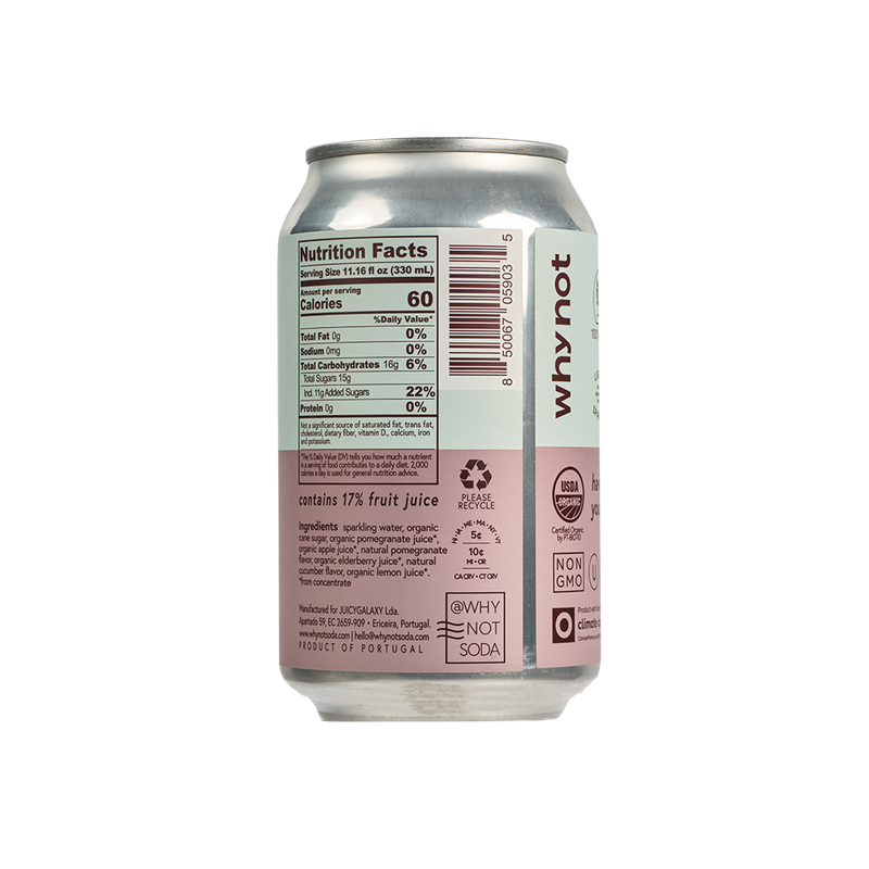 sparkling water, organic cane sugar, organic pomegranate juice*, organic apple juice*, natural pomegranate flavor, organic elderberry juice*, natural cucumber flavor, organic lemon juice*.